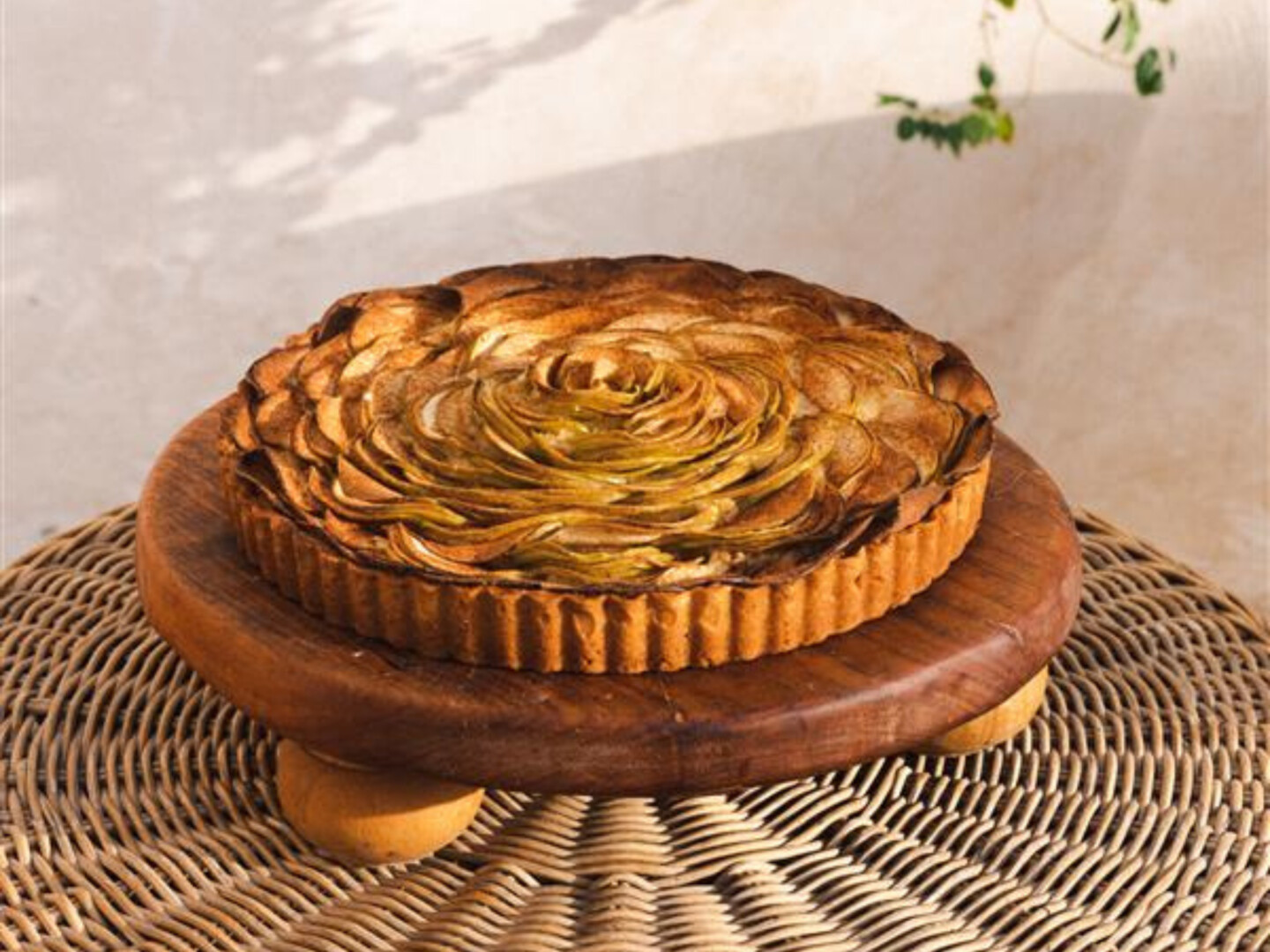 A beautifully handcrafted dessert that combines delicate thin apple slices arranged in an intricate rose pattern, nestled in a buttery, flaky crust. With a perfect balance of sweet and spiced flavors, it delivers a visually captivating and irresistibly delicious experience.