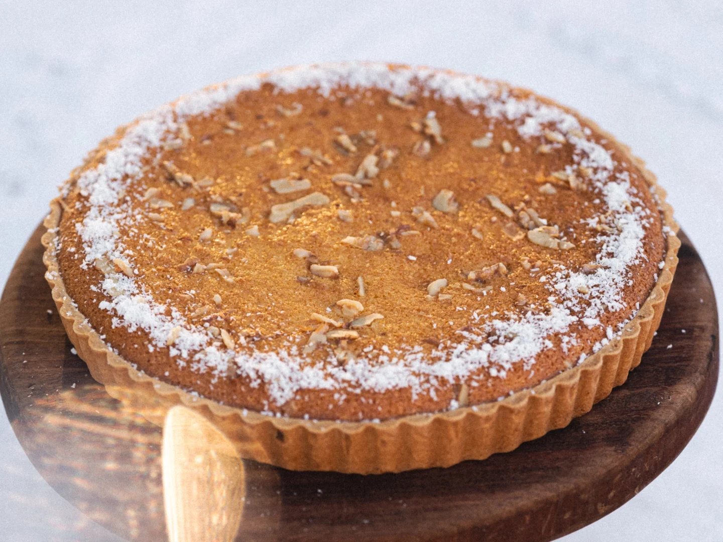 A buttery, flaky crust filled with fresh, rich coconut, lightly sweet with a tropical flavor, topped with golden, toasted coconut for crunch.