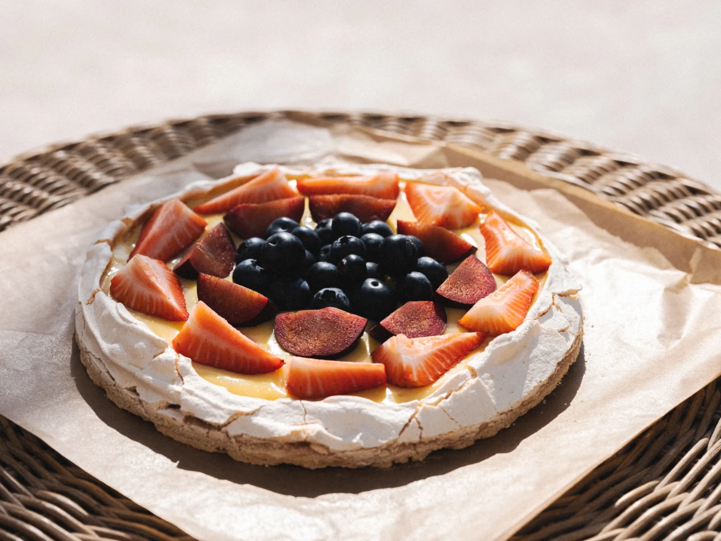 A light, airy dessert with a crisp meringue shell and soft marshmallow-like center, topped with homemade custard cream and vibrant fresh fruits, sweet and refreshing.