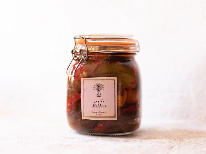 Makdous is a traditional Middle Eastern dish made from baby eggplants that are stuffed with a flavourful mixture of walnuts, red peppers, and garlic. The stuffed eggplants are then preserved in olive oil, creating a rich, tangy, and savoury flavour. Often enjoyed as a breakfast or appetizer, Makdous is famous in Levantine cuisine, cherished for its unique taste and artisanal preparation.