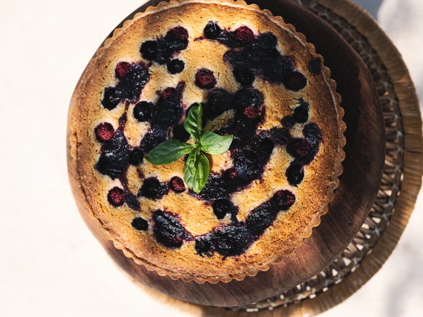 A buttery, crisp pastry crust filled with creamy almond cream and topped with a colorful mix of fresh berries, offering a blend of tart, sweet, and creamy flavors.