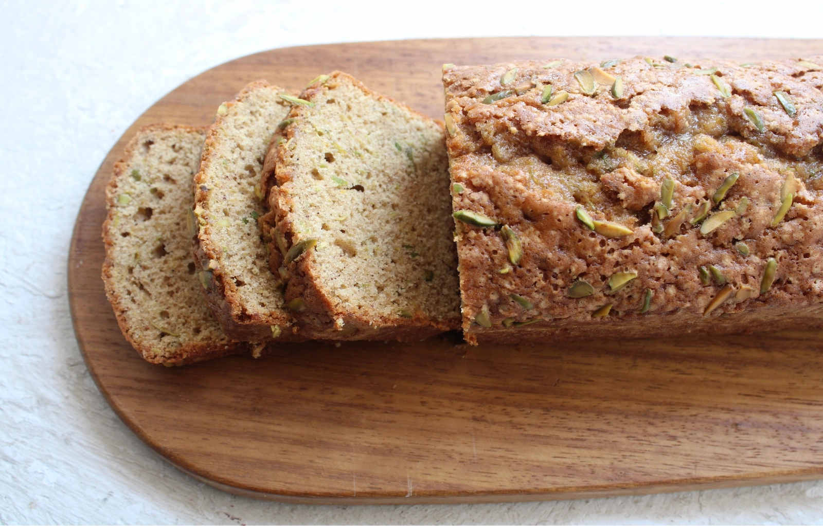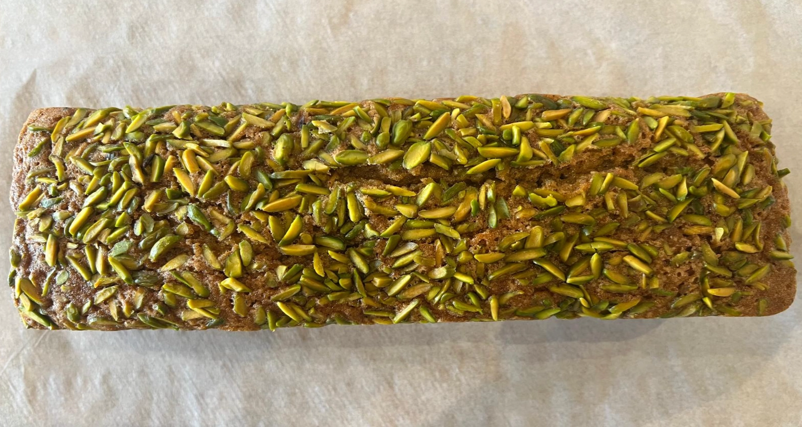 This delightful loaf cake combines organic farm-grown zucchini with pistachios, offering every slice a moist and flavourful experience.